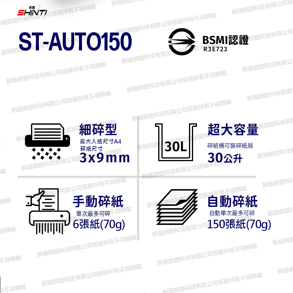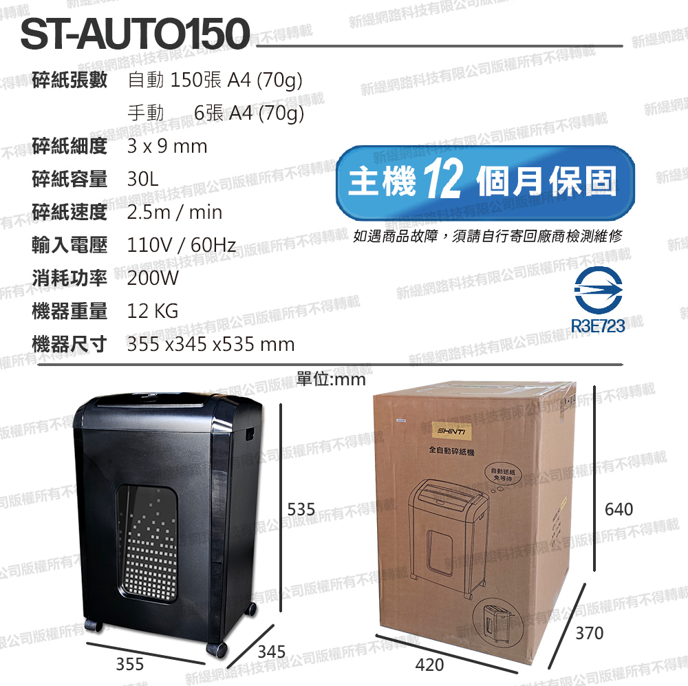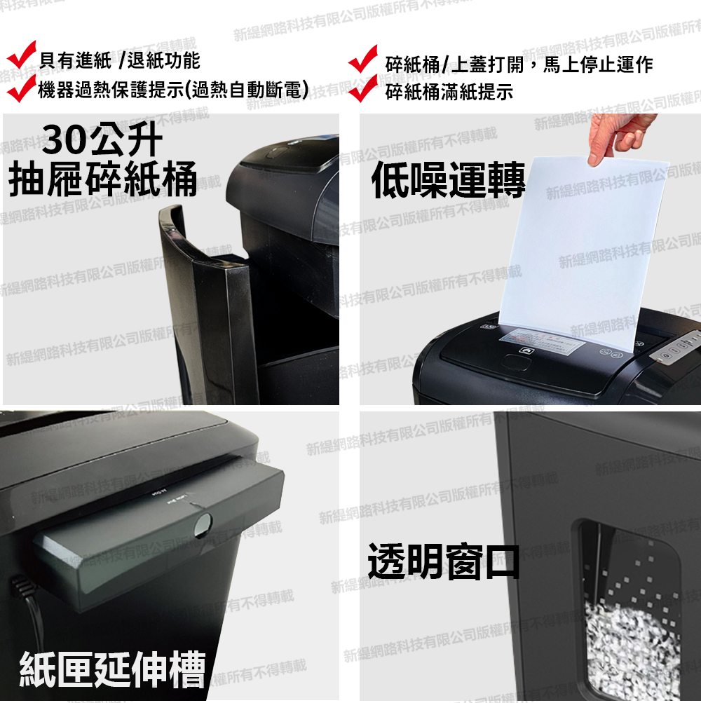 碎紙尺寸: 3x9mm紙筒容量: 30L手動:6張自動:150張 可碎信用卡 機器重量:12KG