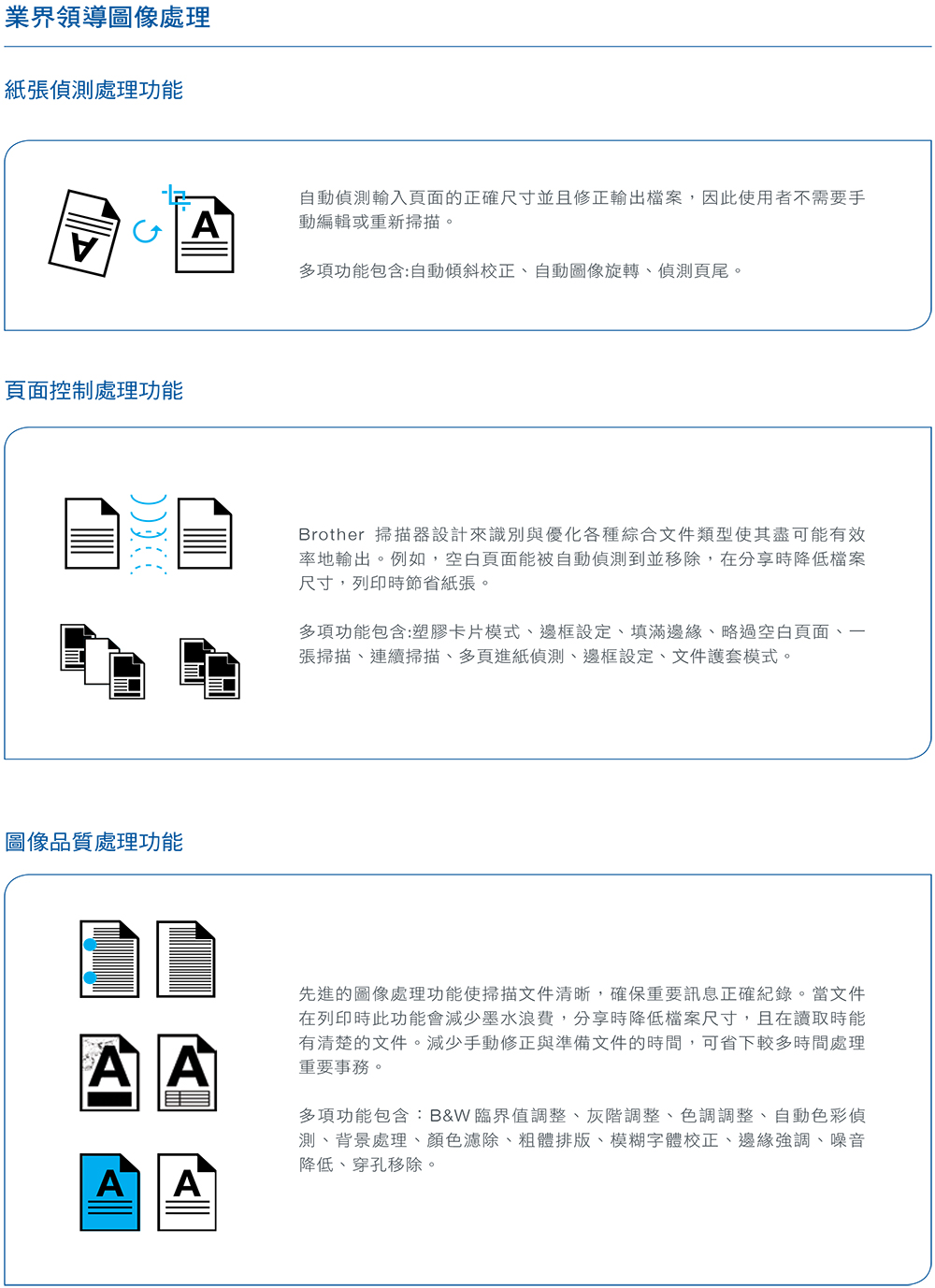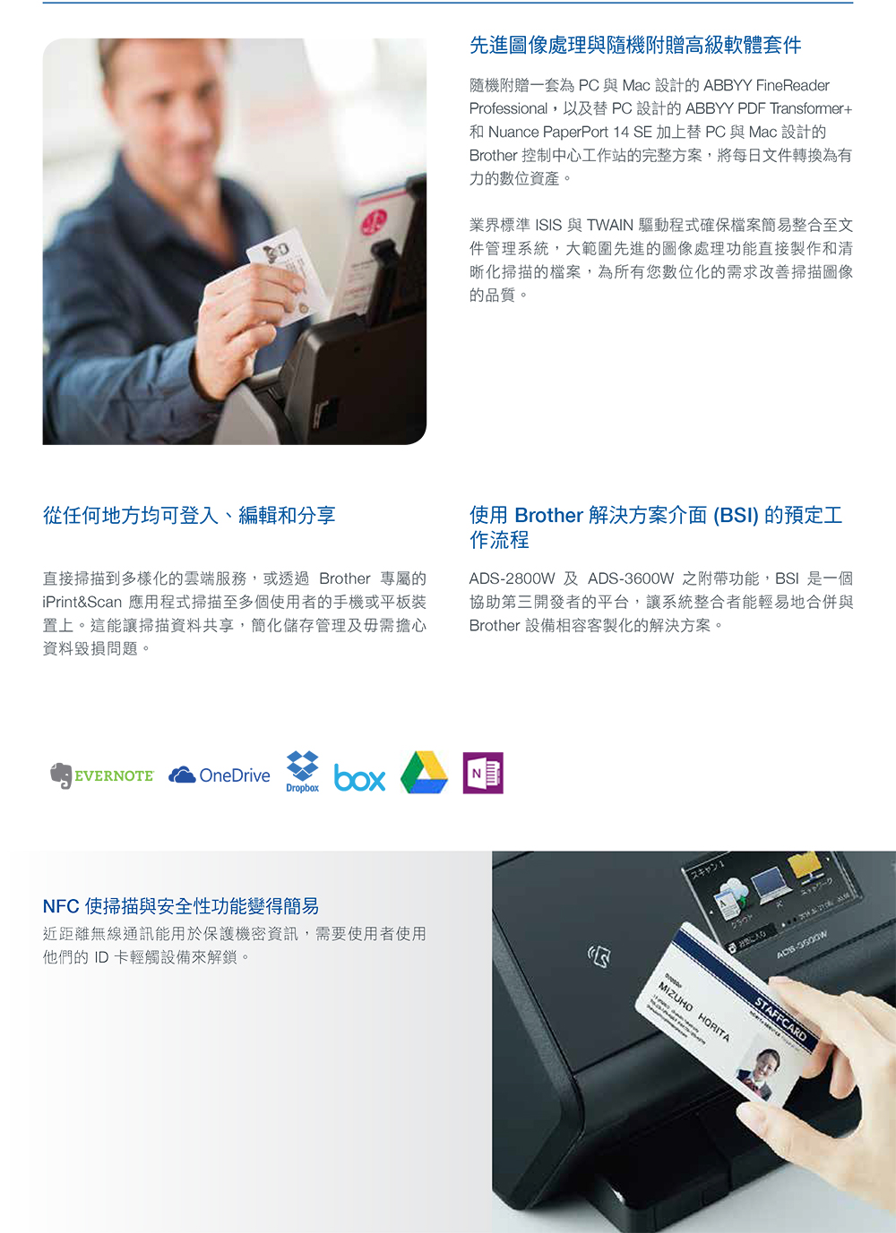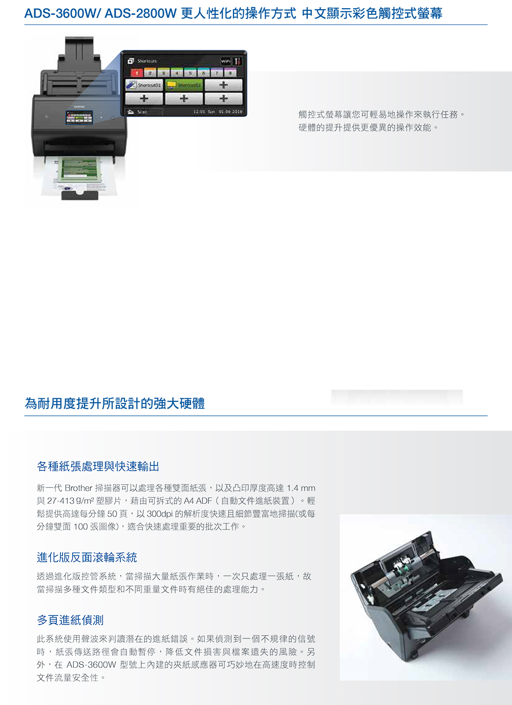 - 自動雙面彩色掃描 / 50 ppm / 600x600 dpi- 有線網路 / 無線網路 / NFC / 掃描至USB, Email / 安全鎖- 3.7 "中文彩色觸控螢幕 / 50頁自動進紙 / 證件掃描- 多頁進紙偵測 / 傾斜校正 / 空白頁偵測