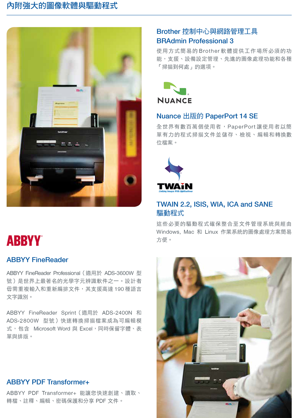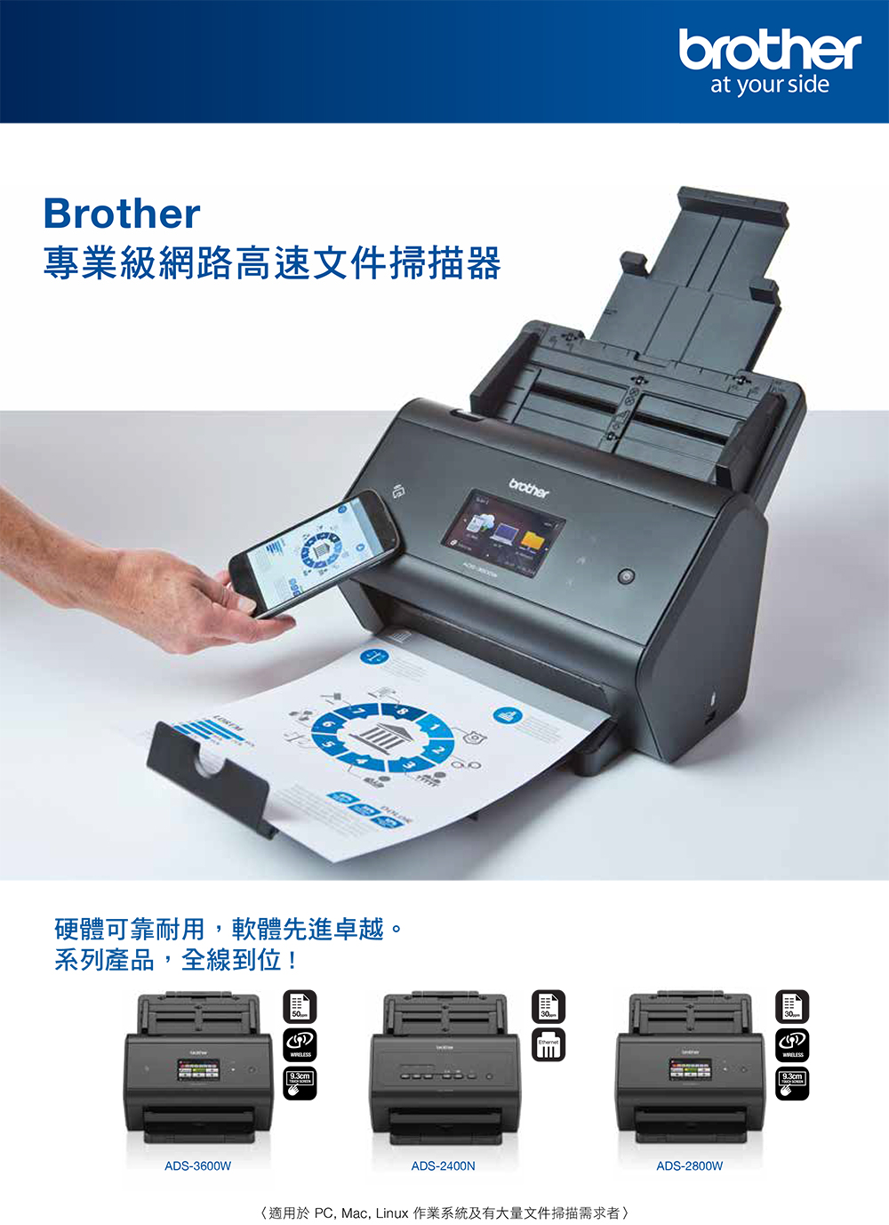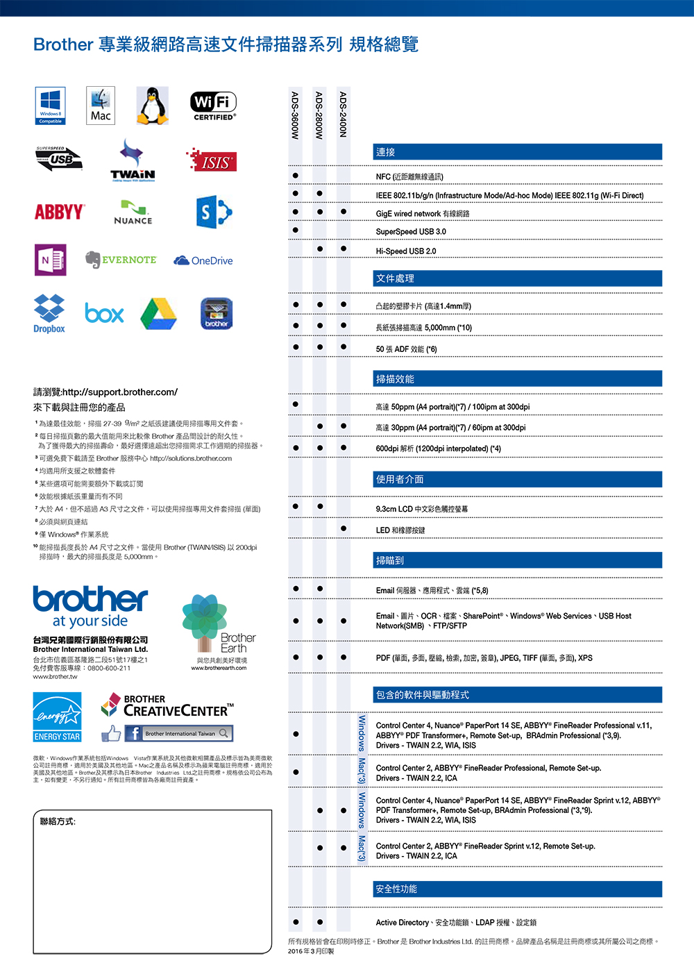 - 自動雙面彩色掃描 / 50 ppm / 600x600 dpi- 有線網路 / 無線網路 / NFC / 掃描至USB, Email / 安全鎖- 3.7 "中文彩色觸控螢幕 / 50頁自動進紙 / 證件掃描- 多頁進紙偵測 / 傾斜校正 / 空白頁偵測