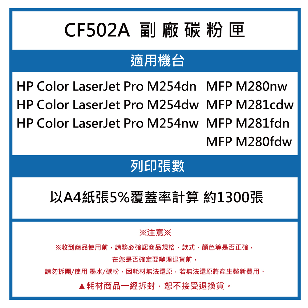 CF502A副廠黃色碳粉匣/適用機型HP Color LaserJet Pro M254dn / M254dw / M254nw / MFP M280nw / M281cdw / M281fd-co-